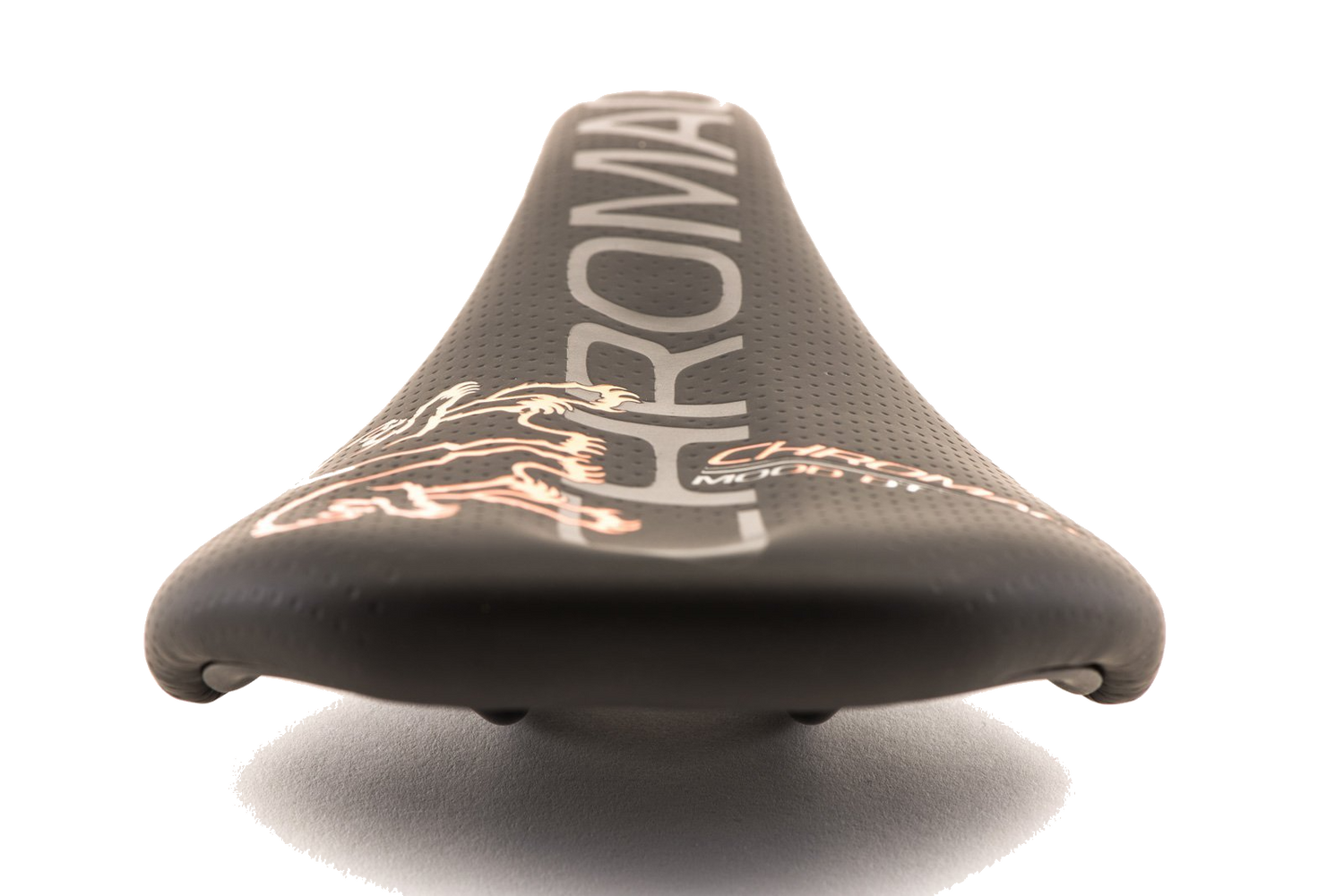 The narrow platform design has chromo rails for extra strength while still being very light weight. It features a firm sitting platform with a gentle scoop at the rear, and a roll-away nose for climbing control. A narrow overall shape offers clearance for long distance seated pedalling. The smooth perimeter is easy to move around and has a round edge to set a knee against for stability.